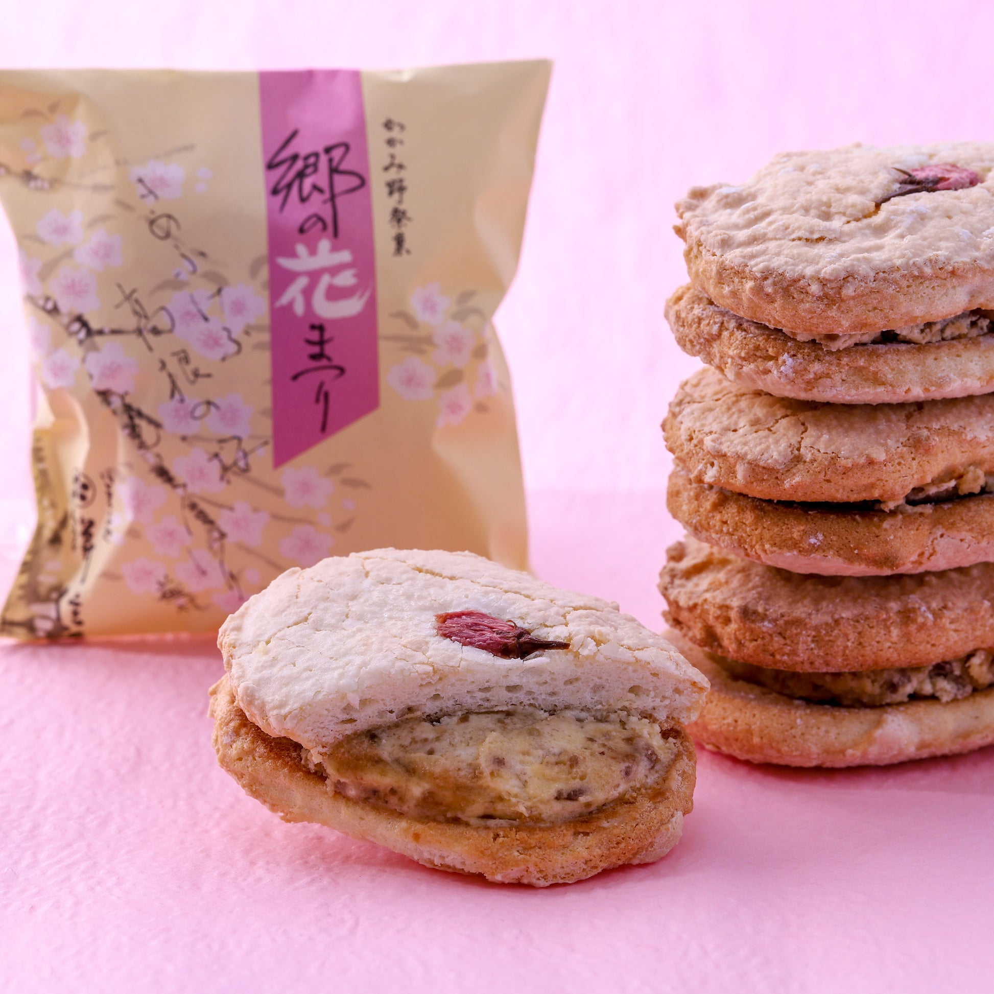 桜の花びらをアクセントにしたダックワーズです。粒粒食感の栗に、